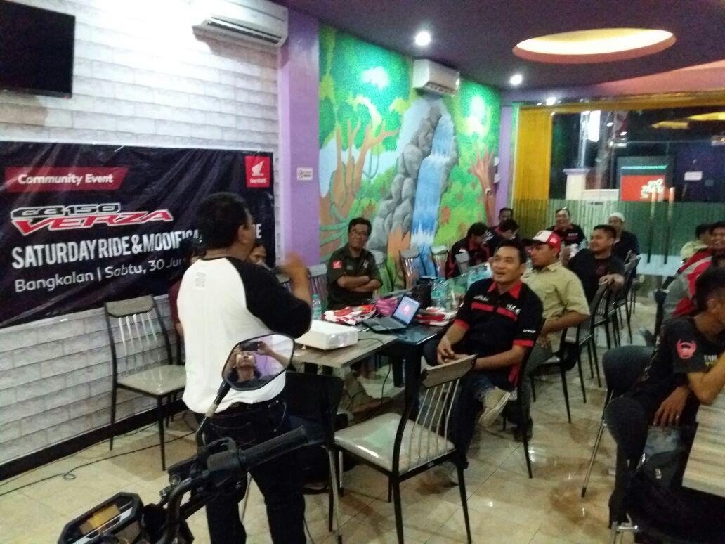 Sebanyak 100 peserta yang tergabung dari Surabaya Honda Community serta Paguyuban Honda Madura mengikuti kegiatan edukasi Modification Garage dengan pemateri kawakan yakni Bung Indramawan dari INCREASE (Inovative & Creative Automotive Society) Salah satu Asosiasi yang menampung aspirasi industri otomotif di Indonesia. Bersamaan dengan launching ni motor PT Astra Honda Motor memberikan Challenge kepada builder – builder ternama Indonesia untuk merombak Honda CB150 Verza biar makin kece, antara lain yakni Deus Ex Machina, Retro Syndicate, dan Baru Motor Sport. Dari hasil ketiga rekanan PT Astra Honda Motor ini yang dibahas dalam sharing komunitas bareng Bung Indra yang bisa menjadi inspirasi dalam memodifikasi Honda CB 150 Verza menjadi semakin Kece.