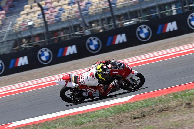 Memulai start dari posisi kelima, pebalap 15 tahun tersebut berhasil mempertahankan posisinya untuk terus berada di grup terdepan. Tetapi sayang sekali memasuki lap akhir, terjadi crash yang melibatkan pebalap lainnya.