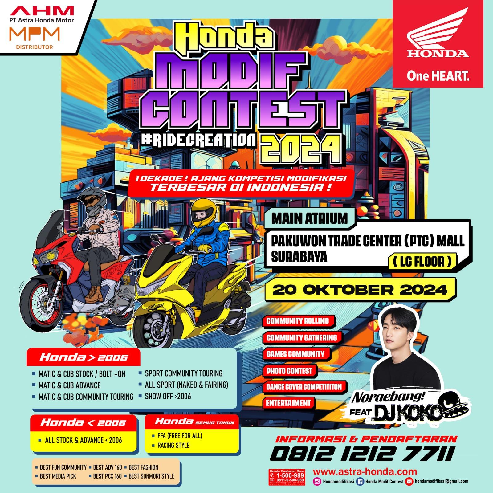 “Jangan lewatkan kesempatan untuk melihat secara langsung karya-karya dari modifikator terbaik khususnya Jawa Timur dan dapatkan program penawaran menarik yang telah kami siapkan. Catat tanggalnya, ajak teman dan keluarga Anda, dan jadilah bagian dari hajatan modifikasi terbesar tanah air Honda Modif Contest “ kata Suhari, Marketing Communication & Development Diviison Head MPM Honda Jatim.