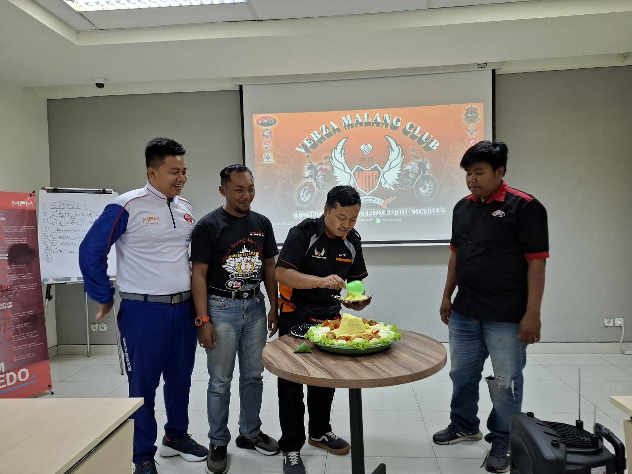 Potong tumpeng menjadi penanda wujud syukur 11 tahun Verza Malang Club berdiri dan menjadi bagian dari dunia permotoran di Malang.