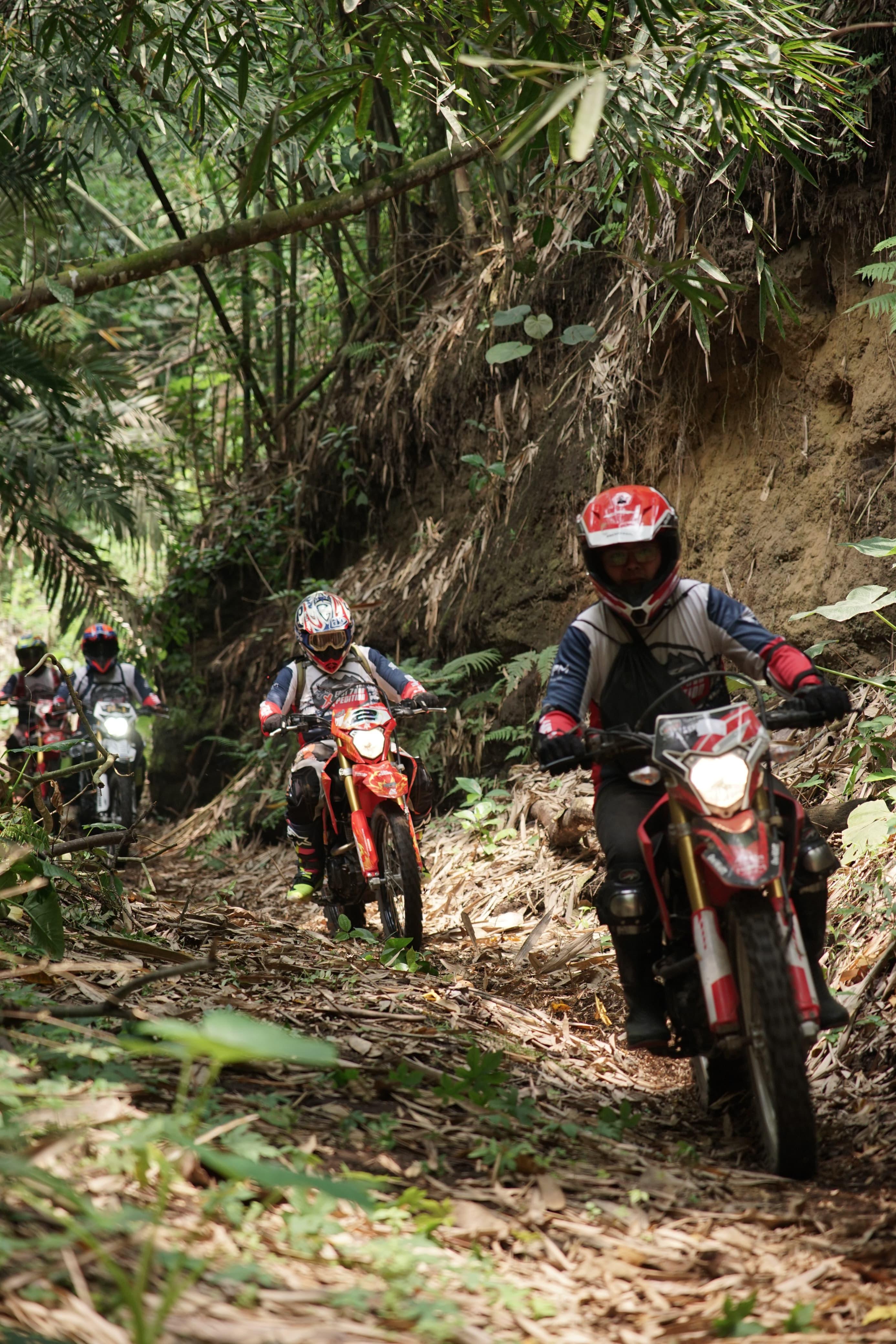 Melintasi medan yang lumayan ekstrim, mulai dari tanah liat, tanah berbatu hingga sungai, Honda CRF150L tampil dengan performa tangguh dan desain yang modern.