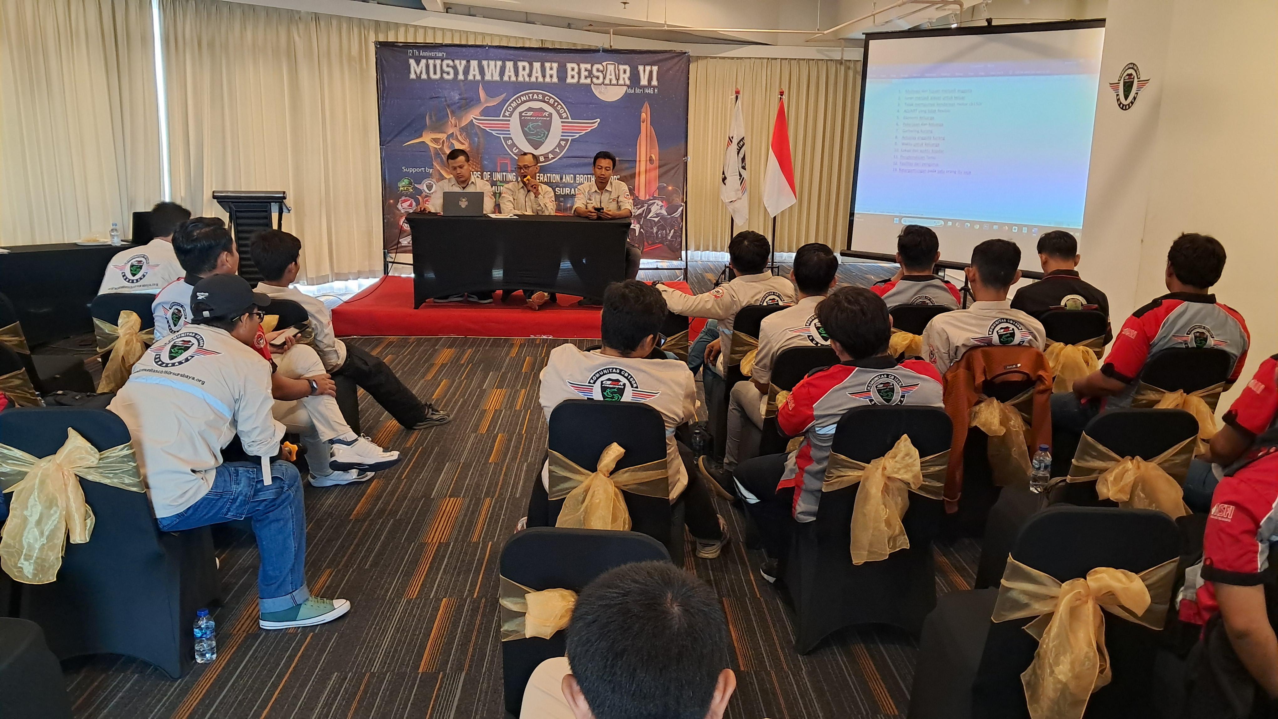 Komunitas CB150R Surabaya (KCS) yang merupakan wadah berkumpul bagi pengguna dan pemilik motor Honda CB150R di kota Surabaya pada Jumat 18 April 2025 melaksanakan kegiatan mubes ke 6 di Twin Tower Hotel Surabaya.