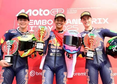 Pembalap berusia 16 tahun ini bersaing ketat dengan 17 pebalap lainnya hingga berhasil memimpin balapan dan kembali meraih podium tertinggi.