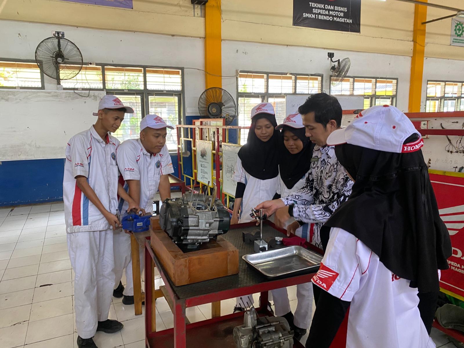 Program ini mencakup integrasi kurikulum industri, pelatihan guru produktif, hingga penyediaan fasilitas praktik sesuai standar bengkel resmi Honda.